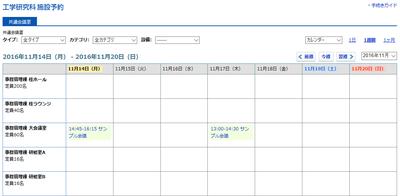 工学研究科向けに共通会議室や講義室等の予約システムを運用しています。カレンダー形式で「1日単位」・「1週間単位」・「1ヶ月単位」・「設備ごと」を切り替えて施設の予約状況を確認できるシステムです。